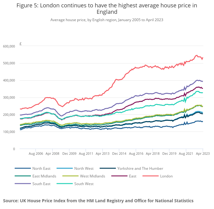London's average house prices remain the most expensive of any region in the UK, with an average price of £534,000 in April 2023.