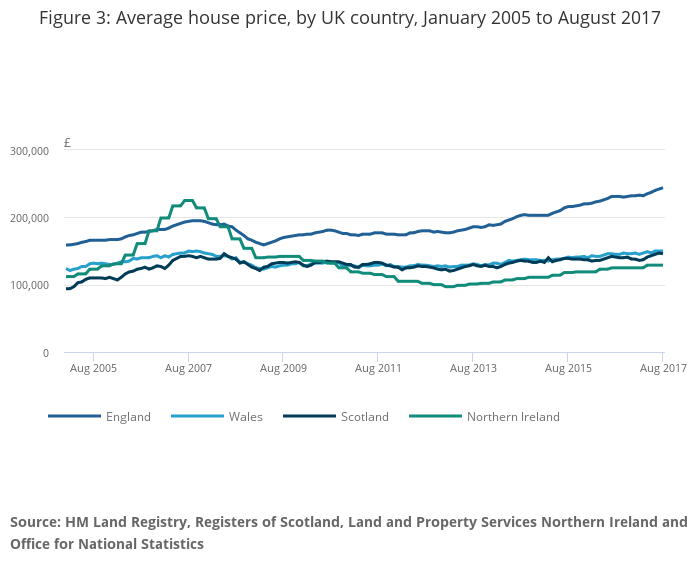 Figure 3: Average house price, by UK country, January 2005 to August 2017
