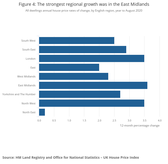 Image .csv .xlsThe East Midlands was the English region with the highest annual house price growth, with average prices increasing by 3.6% to £202,000 in the year to August 2020, down from 4.0% in July 2020 (Figure 4).
