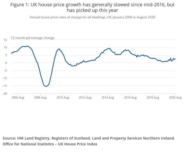 UK average house prices increased by 2.5% over the year to August 2020, up from 2.1% in July 2020.