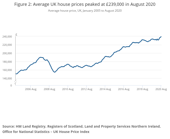Figure 2: Average UK house prices peaked at £239,000 in August 2020