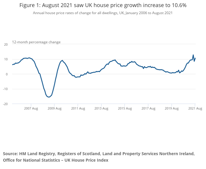 UK average house prices increased by 10.6% over the year to August 2021, up from 8.5% in July.