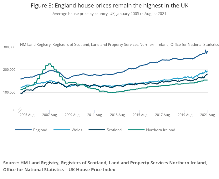 Average house prices increased over the year in England to £281,000 (9.8%), in Wales to £195,000 (12.5%), in Scotland to £181,000 (16.9%) and in Northern Ireland to £153,000 (9.0%).