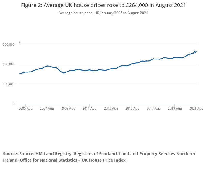 The average UK house price was £264,000 in August 2021, which is £25,000 higher than this time last year.