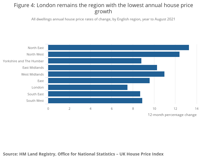 The lowest annual growth was in London, where average prices increased by 7.5% over the year to August 2021, up from 2.9% in July 2021, which represents the strongest annual growth in London since August 2016.