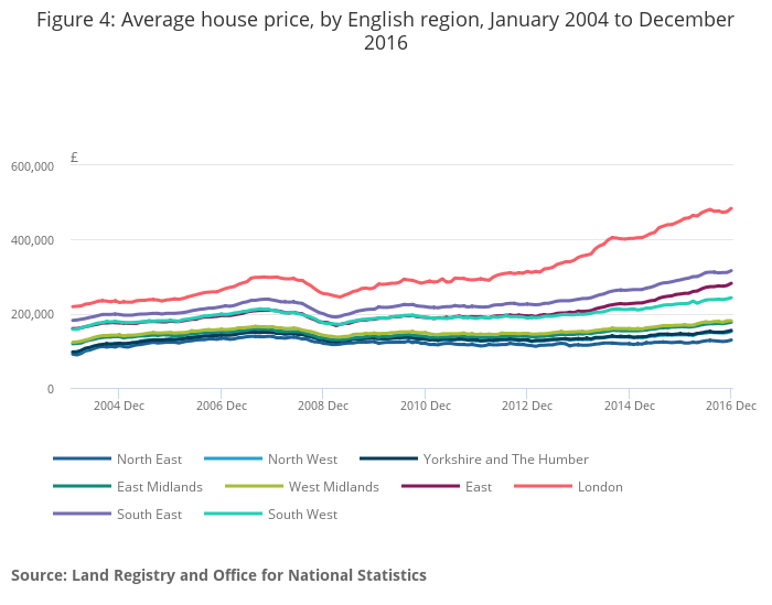 Figure 4: Average house price, by English region, January 2004 to December 2016