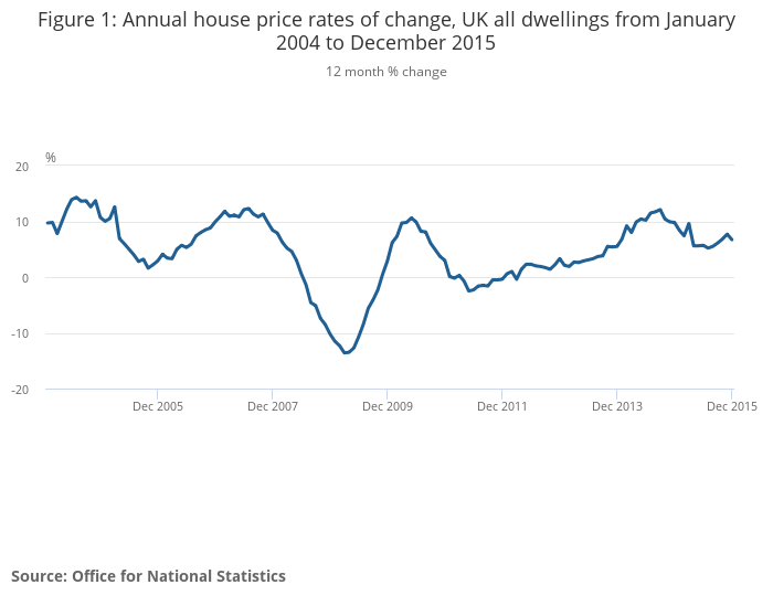 Figure 1: Annual house price rates of change, UK all dwellings from January 2004 to December 2015