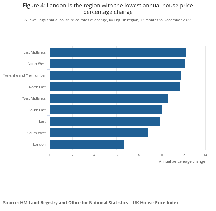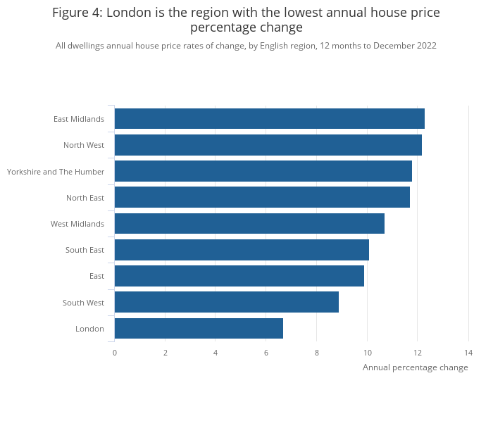London was the English region with the lowest annual house price inflation, with average prices increasing by 6.7% in the 12 months to December 2022. This was up from an annual percentage change of 6.4% in November 2022.