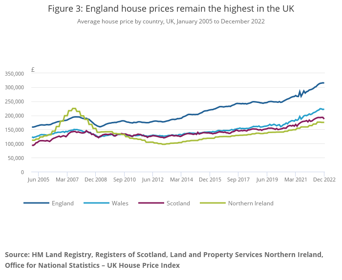 Average house prices increased over the 12 months to £315,000 (10.3%) in England, £222,000 in Wales (10.3%), £187,000 in Scotland (5.7%) and £175,000 in Northern Ireland (10.2%).