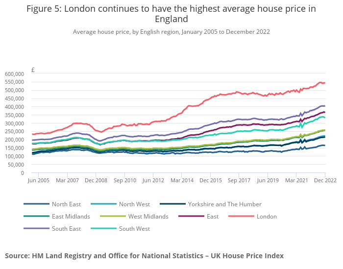 London's average house prices remain the most expensive of any region in the UK, with an average price of £543,000 in December 2022.