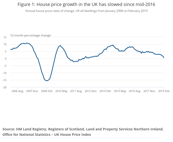 Average house prices in the UK increased by 0.6% in the year to February 2019, down from 1.7% in January 2019 (Figure 1). This is the lowest annual rate since September 2012 when it was 0.4%. Over the past two years, there has been a slowdown in UK house price growth, driven mainly by a slowdown in the south and east of England.