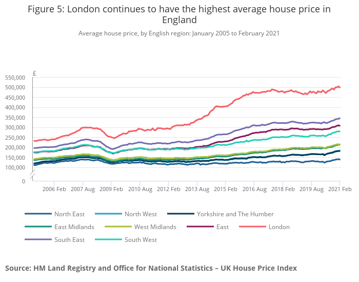 London’s average house prices remain the most expensive of any region in the UK at an average of £496,000 in February 2021.