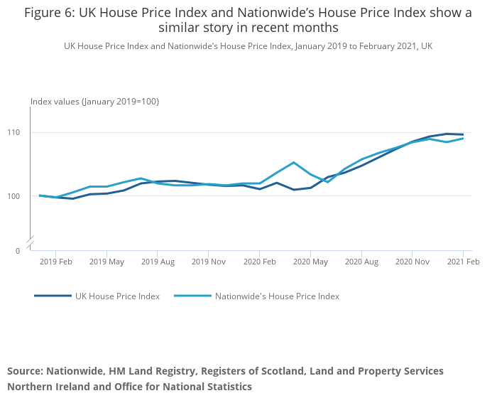 UK House Price Index and Nationwide’s House Price Index, January 2019 to February 2021, UK