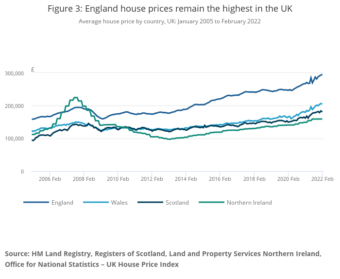Average house prices increased over the year in England to £296,000 (10.7%), in Wales to £205,000 (14.2%), in Scotland to £181,000 (11.7%) and in Northern Ireland to £159,000 (7.9%).