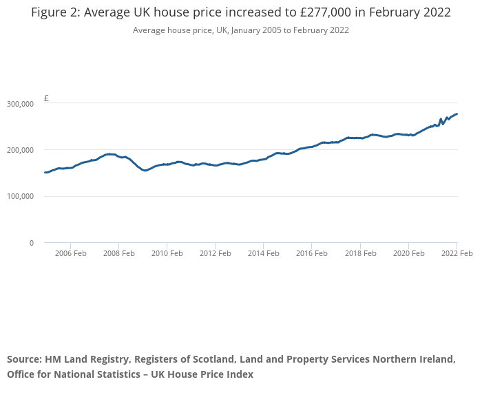 The average UK house price was £277,000 in February 2022, which is £27,000 higher than this time last year.