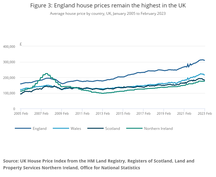 Average house price by country, UK, January 2005 to February 2023