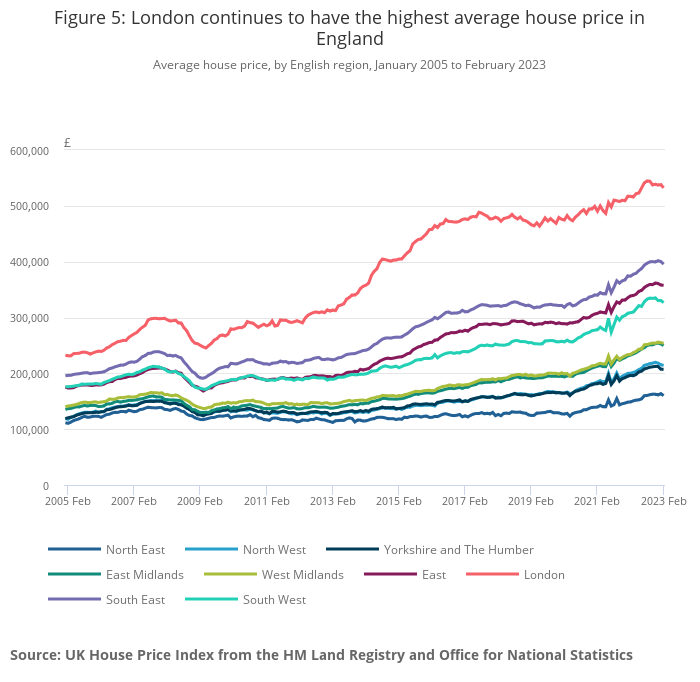 London's average house prices remain the most expensive of any region in the UK, with an average price of £532,000 in February 2023.