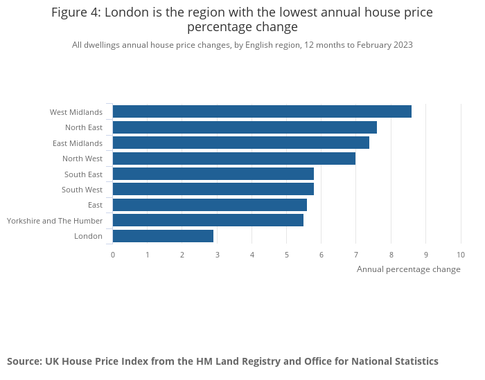 London was the English region with the lowest annual house price inflation, with average prices increasing by 2.9% in the 12 months to February 2023. This was down from an annual percentage change of 4.0% in January 2023.
