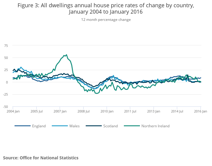 During the year to January 2016, average house prices increased by 8.6% in England (up from 7.3% in the year to December 2015), 0.1% in Scotland (up from -0.2%) and 0.8% in Northern Ireland (down from 1.5%). There was a 0.3% decrease in average house prices in Wales (down from a 1.0% increase in the year to December 2015).