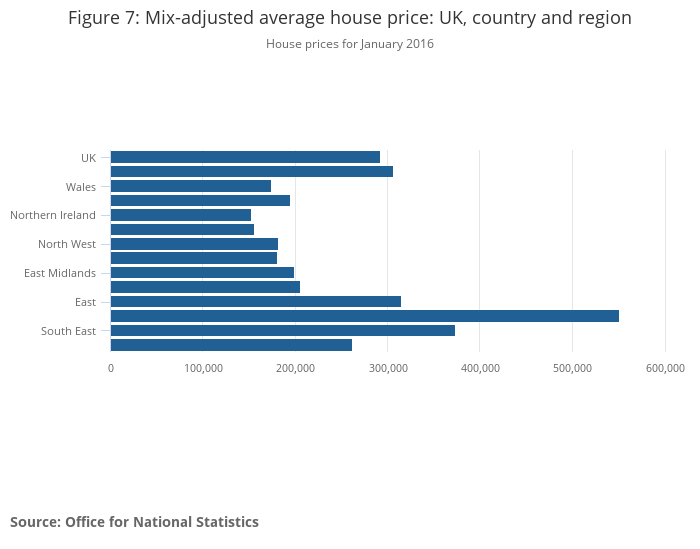 In January 2016, London continued to be the English region with the highest average house price at a record high of £551,000 and the North East had the lowest average house price at £156,000. London, the South East and the East all had prices higher than the UK average price of £292,000.