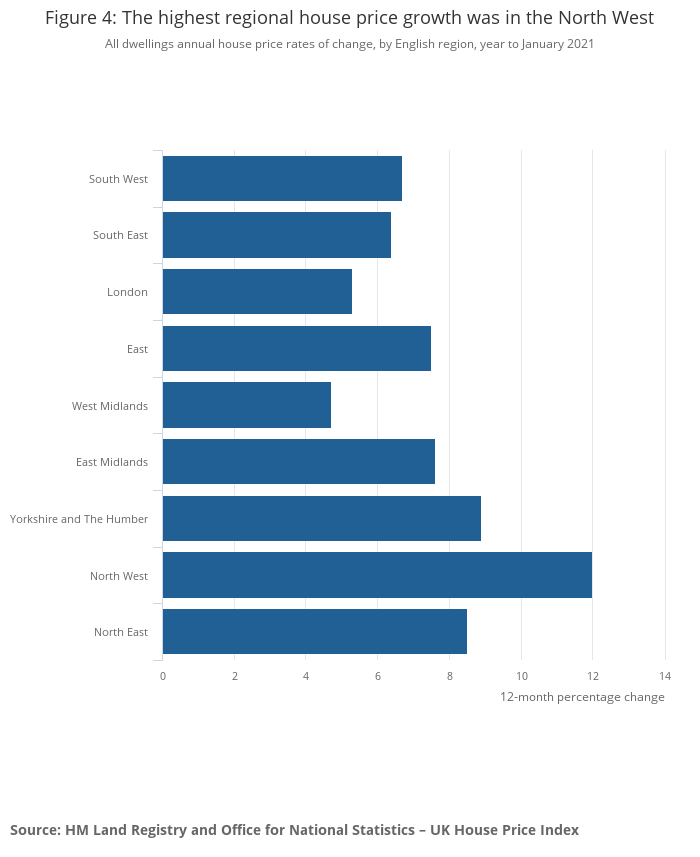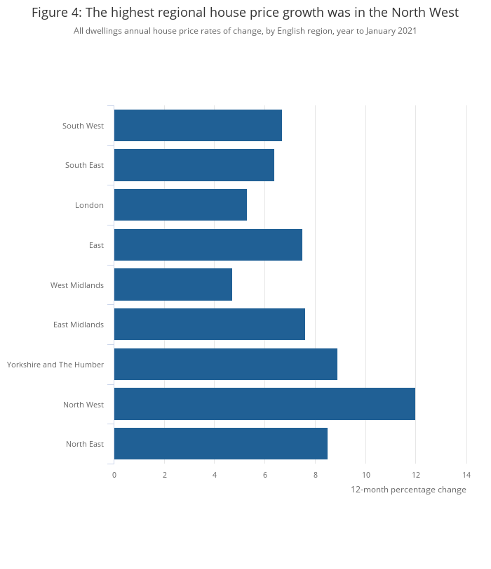 Image .csv .xlsThe North West was the region with the highest annual house price growth, with average prices increasing by 12.0% in the year to January 2021. This is the highest annual growth rate the North West has seen since June 2005. This was up from 10.8% in December 2020 (Figure 4).