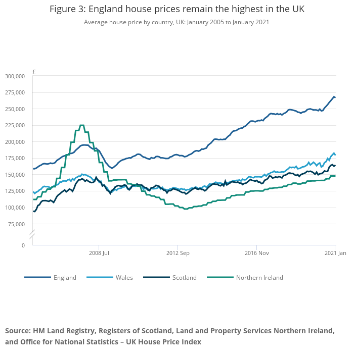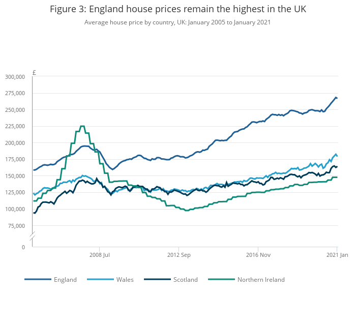 - Average house prices increased over the year in England to £267,000 (7.5%), in Wales to £179,000 (9.6%), in Scotland to £164,000 (6.9%) and in Northern Ireland to £148,000 (5.3%).