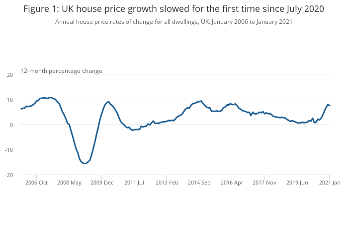 The latest house price data published on GOV.UK by HM Land Registry for January 2021 show that average house prices in the UK increased by 7.5% in the year to January 2021, down from 8.0% in the year to December 2020 (Figure 1).