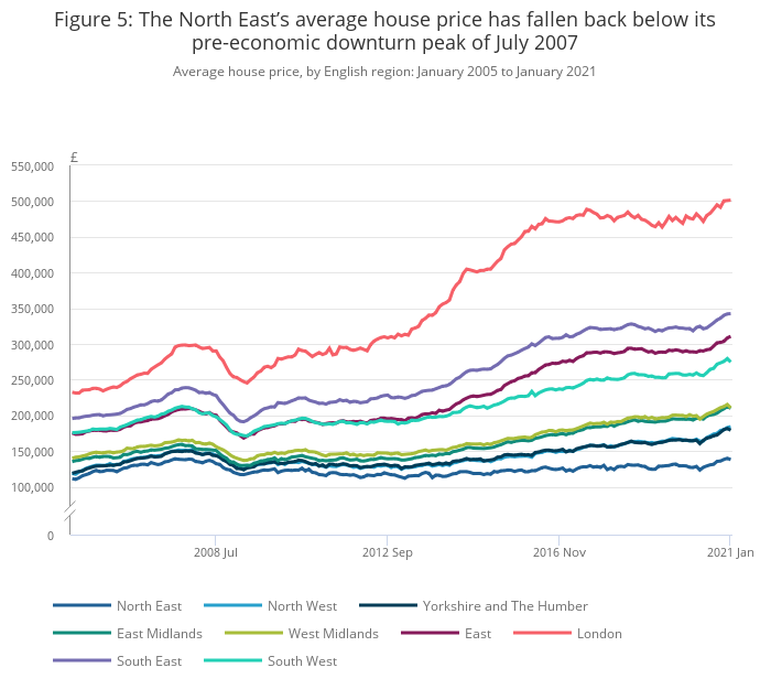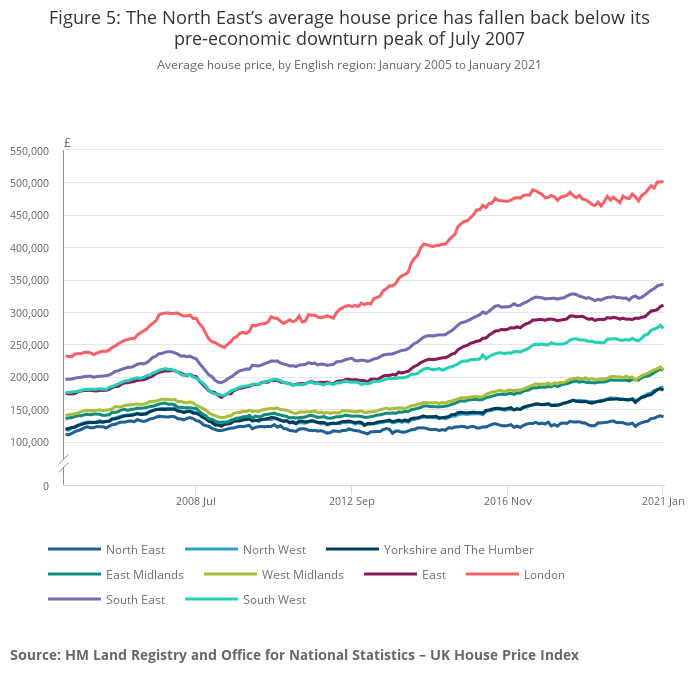 The North East continued to have the lowest average house price, at £138,000, and although it surpassed its pre-economic downturn peak of July 2007 in December 2020, its average house price has fallen back below this level in January 2021 (Figure 5).
