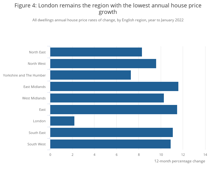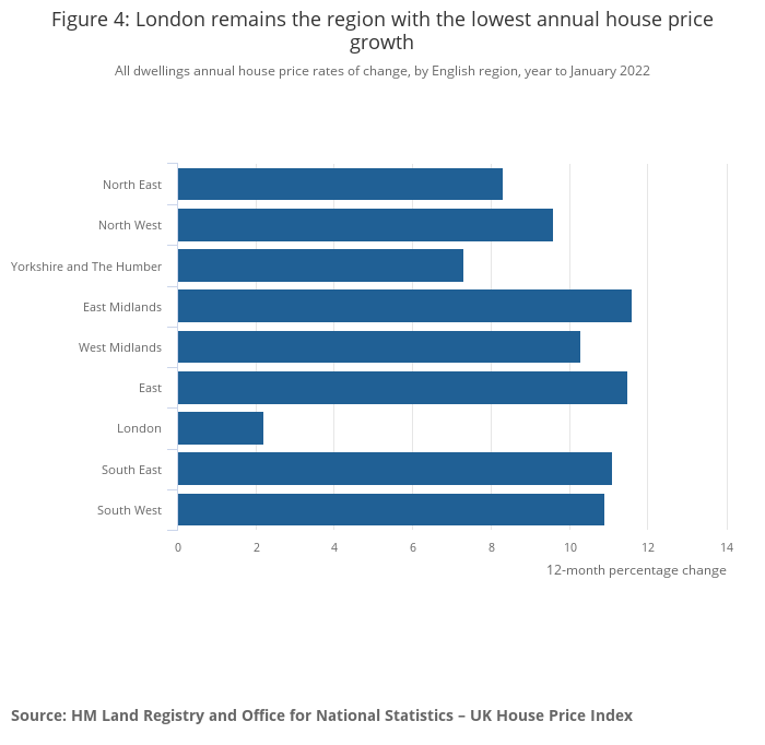 The lowest annual house price growth was in London, where average prices increased by 2.2% over the year to January 2022, down from 5.1% in December 2021.