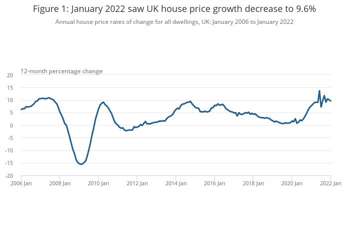 The latest house price data published on GOV.UK by HM Land Registry (HMLR) for January 2022 show that average house prices in the UK increased by 9.6% in the year to January 2022, down from 10.0% in the year to December 2021 (Figure 1).