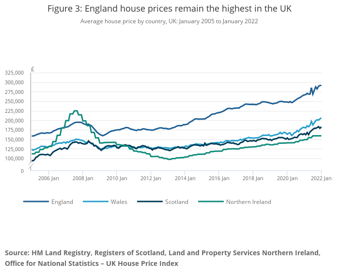 As the tax breaks were originally scheduled to conclude at the end of March 2021, it is likely that March's average house prices were slightly inflated as buyers rushed to ensure their house purchases were scheduled to complete ahead of this deadline. This effect was then further exaggerated in June 2021 in line with the extension to the holiday on taxes paid on property purchases in England, Wales and Northern Ireland. They could be seen again in September 2021 when the last of the tax holidays came to an end in England. An increase in prices since then has resulted in a record average house price level in the UK of £274,000 in January 2022.