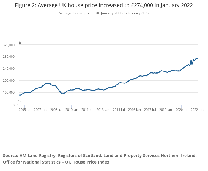 The average UK house price was £274,000 in January 2022, which is £24,000 higher than this time last year.