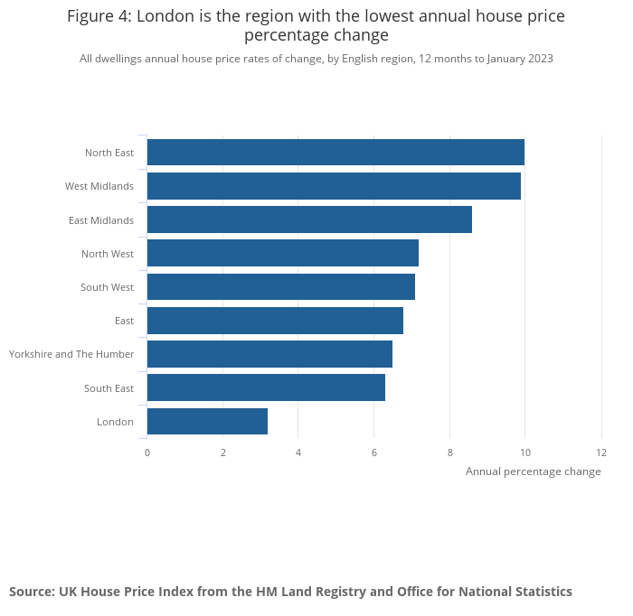 London was the English region with the lowest annual house price inflation, with average prices increasing by 3.2% in the 12 months to January 2023. This was down from an annual percentage change of 5.9% in December 2022.