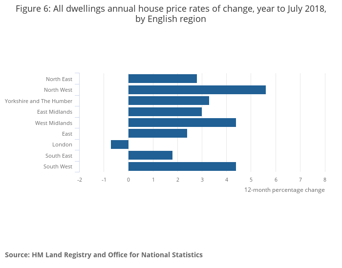 The lowest annual growth was in London, where prices decreased by 0.7% over the year. London has shown a general slowdown in its annual growth rate since mid-2016. The second-lowest annual growth was in the South East, where prices increased by 1.8% in the year to July 2018, followed by the East of England, where prices increased by 2.4%. This is the first time since May 2009 that London, the South East and the East of England have been the lowest-ranked regions for annual growth.