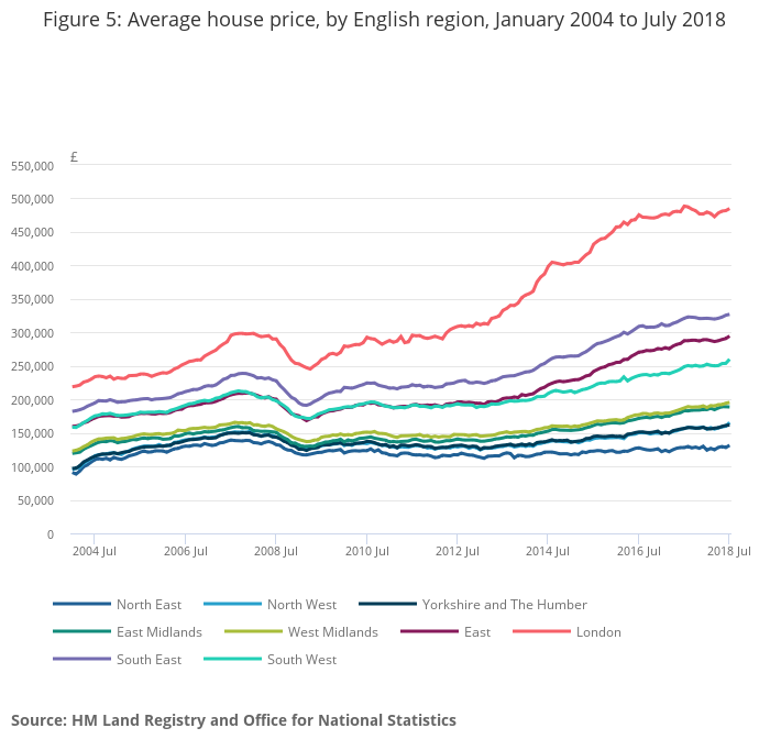 Figure 5: Average house price, by English region, January 2004 to July 2018