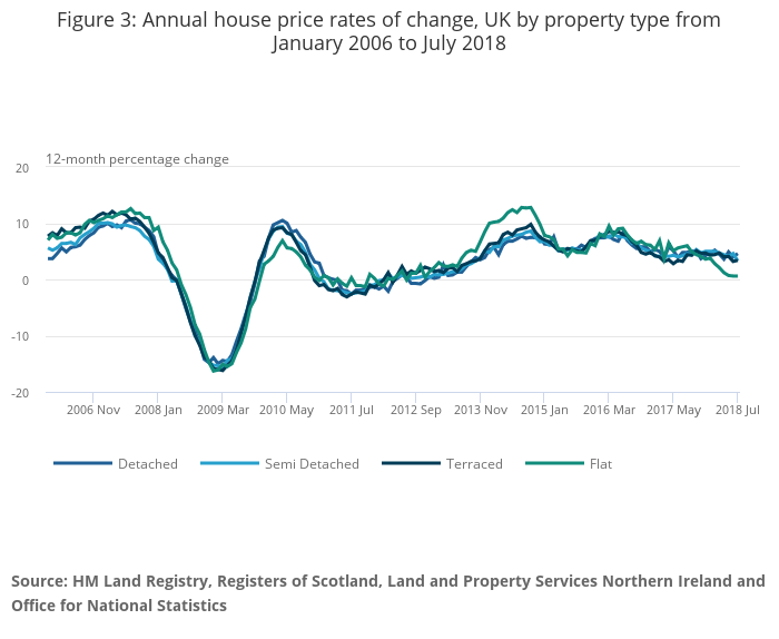 Average house prices in the UK have increased by 3.1% in the year to July 2018 (down slightly from 3.2% in June 2018). This is the lowest UK annual rate since August 2013 when it was 3.0%. The annual growth rate has slowed since mid-2016 and has remained under 5%, with the exception of October 2017, throughout 2017 and into 2018.
