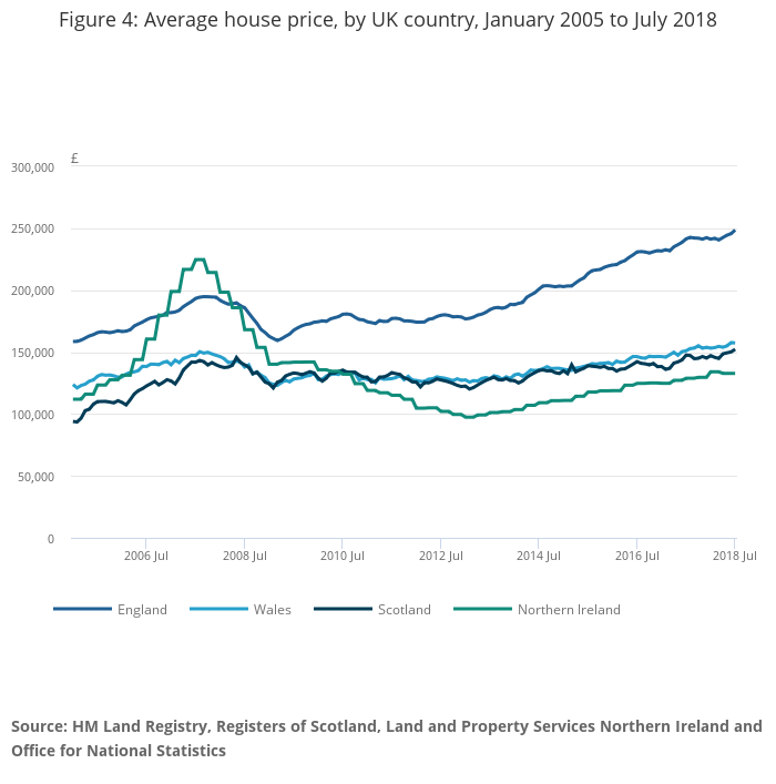The main contribution to the increase in UK house prices came from England, where house prices increased by 3.0% over the year to July 2018, with the average price in England now £249,000. Wales saw house prices increase by 4.2% over the last 12 months to stand at £157,000. In Scotland, the average price increased by 3.2% over the year to stand at £152,000. The average price in Northern Ireland currently stands at £133,000, an increase of 4.4% over the year to Quarter 2 (Apr to June) 2018.