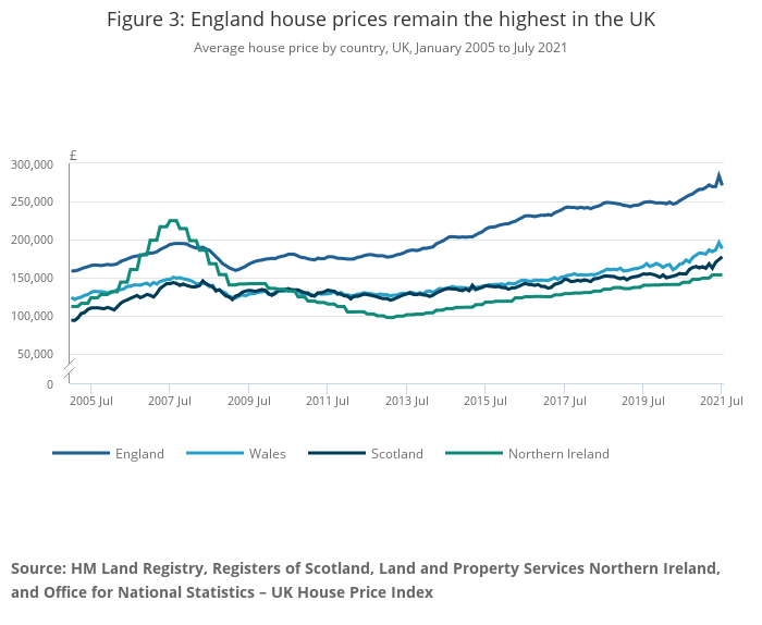 - Average house prices increased over the year in England to £271,000 (7%), in Wales to £188,000 (11.6%), in Scotland to £177,000 (14.6%) and in Northern Ireland to £153,000 (9.0%).