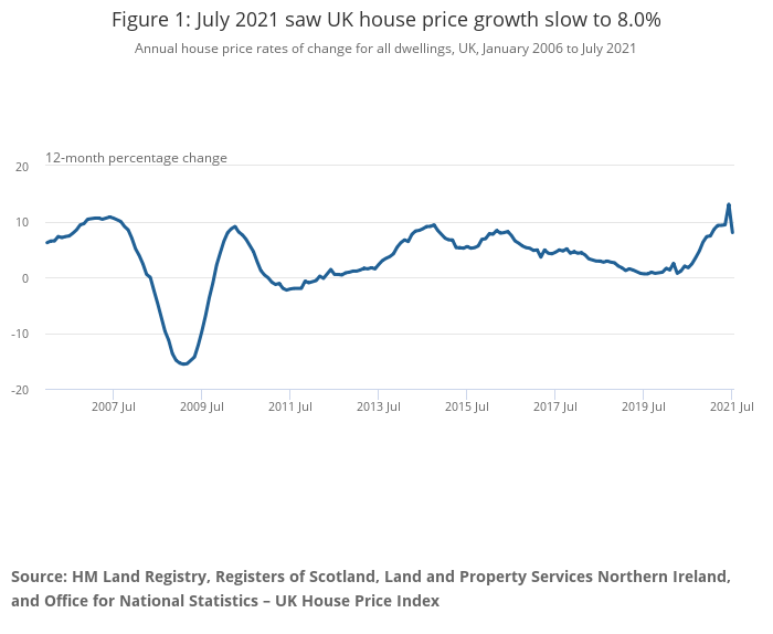 The latest house price data published on GOV.UK by HM Land Registry for July 2021 show that average house prices in the UK increased by 8.0% in the year to July 2021, down from 13.1% in the year to June 2021 (Figure 1).