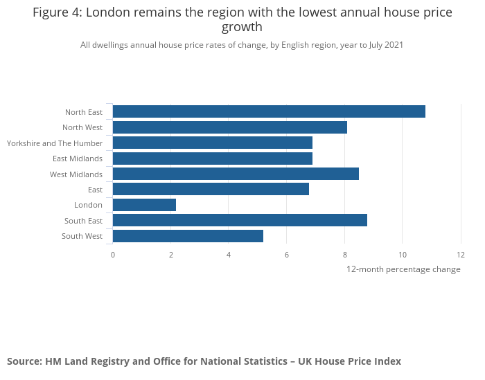 The lowest annual growth was in London, where average prices increased by 2.2% over the year to July 2021, down from 5.1% in June 2021.