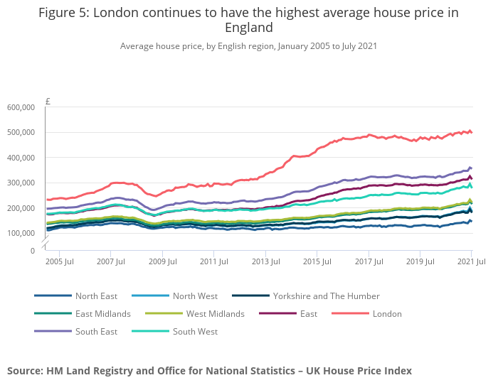 London’s average house prices remain the most expensive of any region in the UK, at an average of £495,000 in July 2021.