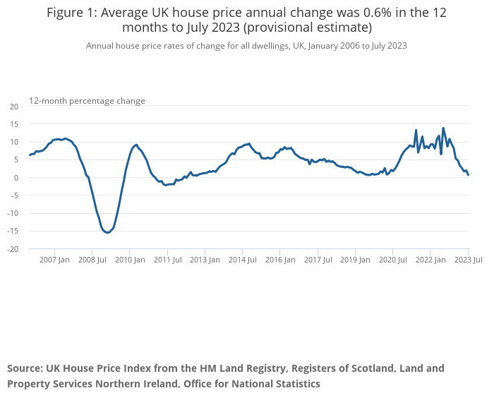 Average UK house prices increased by 0.6% in the 12 months to July 2023 (provisional estimate), down from a revised 1.9% in June 2023.