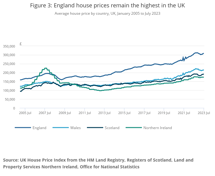 Average house prices increased over the 12 months to July 2023, to £309,000 in England (0.6%), £192,000 in Scotland (0.1%), while average house prices in Wales decreased to £216,000 (negative 0.1%).