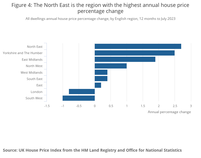 The North East saw the highest annual percentage change of all English regions in the 12 months to July 2023 (2.7%), while the South West saw the lowest (negative 1.0%).
