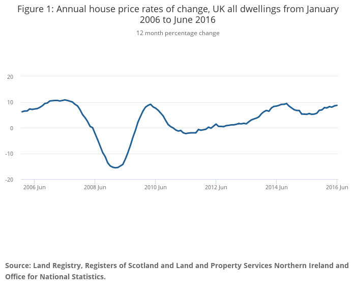 UK average house prices have increased by 8.7% in the year to June 2016 (up from 8.5% in the year to May 2016), continuing the strong growth seen since the end of 2013.