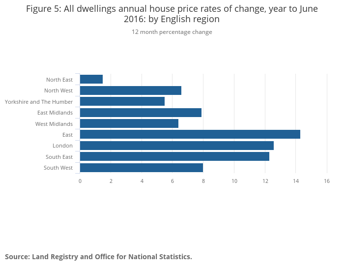 Figure 5: All dwellings annual house price rates of change, year to June 2016: by English region