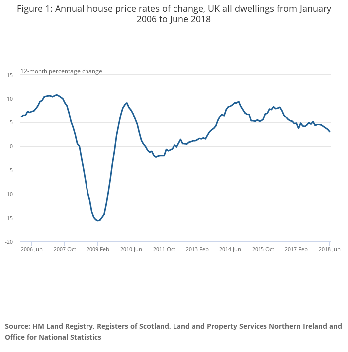 Average house prices in the UK have increased by 3.0% in the year to June 2018 (down from 3.5% in May 2018). This is its lowest annual rate since August 2013 when it was also 3.0%. The annual growth rate has slowed since mid-2016 and has remained under 5%, with the exception of October 2017, throughout 2017 and into 2018.