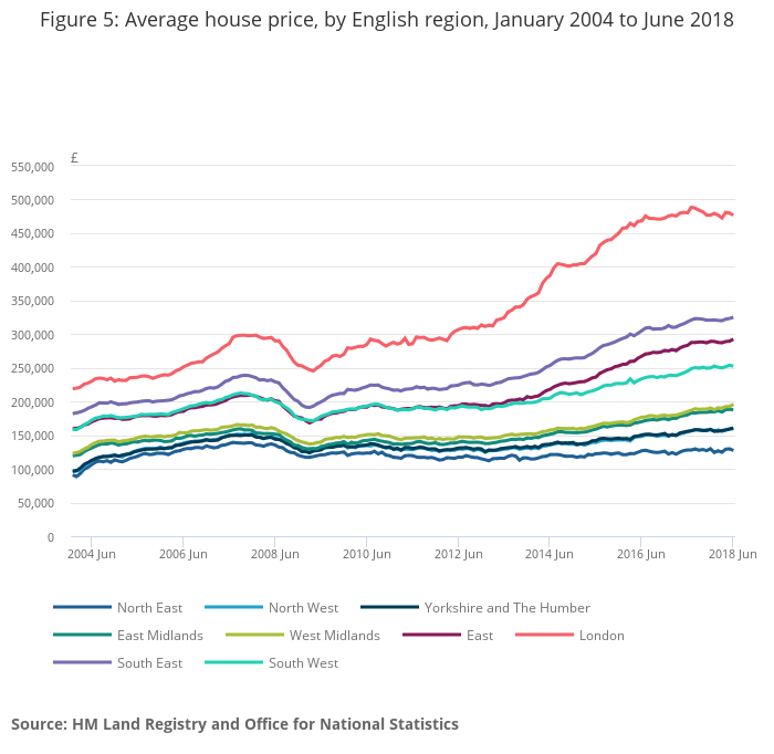 Figure 5: Average house price, by English region, January 2004 to June 2018