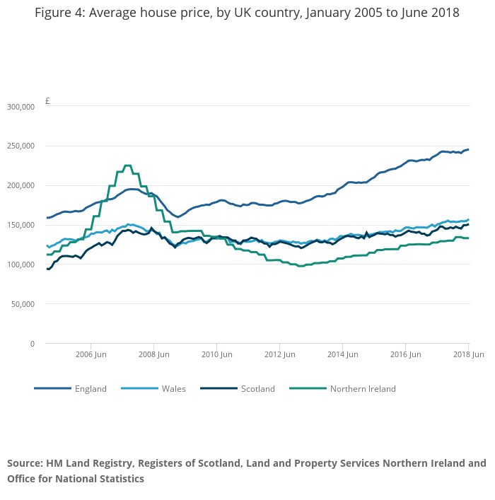 The main contribution to the increase in UK house prices came from England, where house prices increased by 2.7% over the year to June 2018, with the average price in England now £245,000. Wales saw house prices increase by 4.3% over the last 12 months to stand at £157,000. In Scotland, the average price increased by 4.8% over the year to stand at £150,000. The average price in Northern Ireland currently stands at £133,000, an increase of 4.4% over the year to Quarter 2 (Apr to June) 2018.