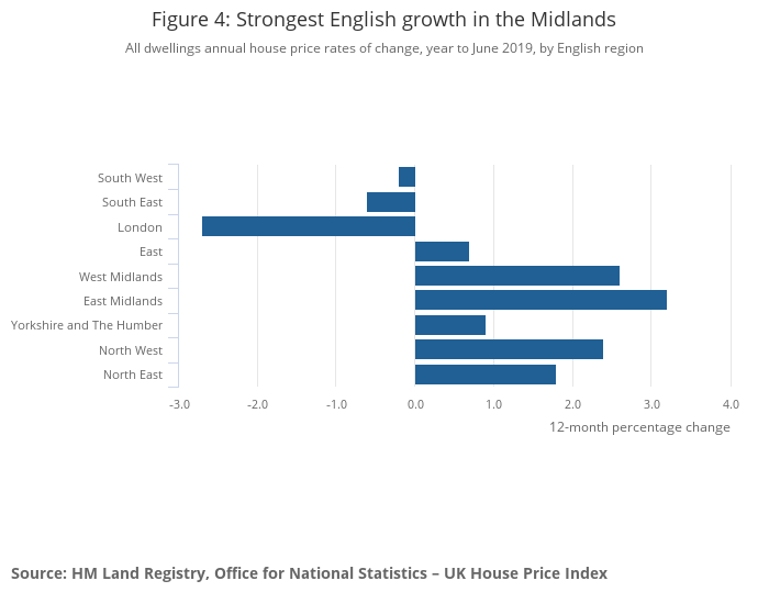The East Midlands was the English region with the highest annual house price growth, with prices increasing by 3.2% in the year to June 2019 (Figure 4). This was followed by the West Midlands, with prices increasing by 2.6%. The lowest annual growth was in London where prices fell by 2.7% over the year to June 2019, up from a fall of 3.1% in May 2019. This was followed by the South East, where prices fell by 0.6% over the year.